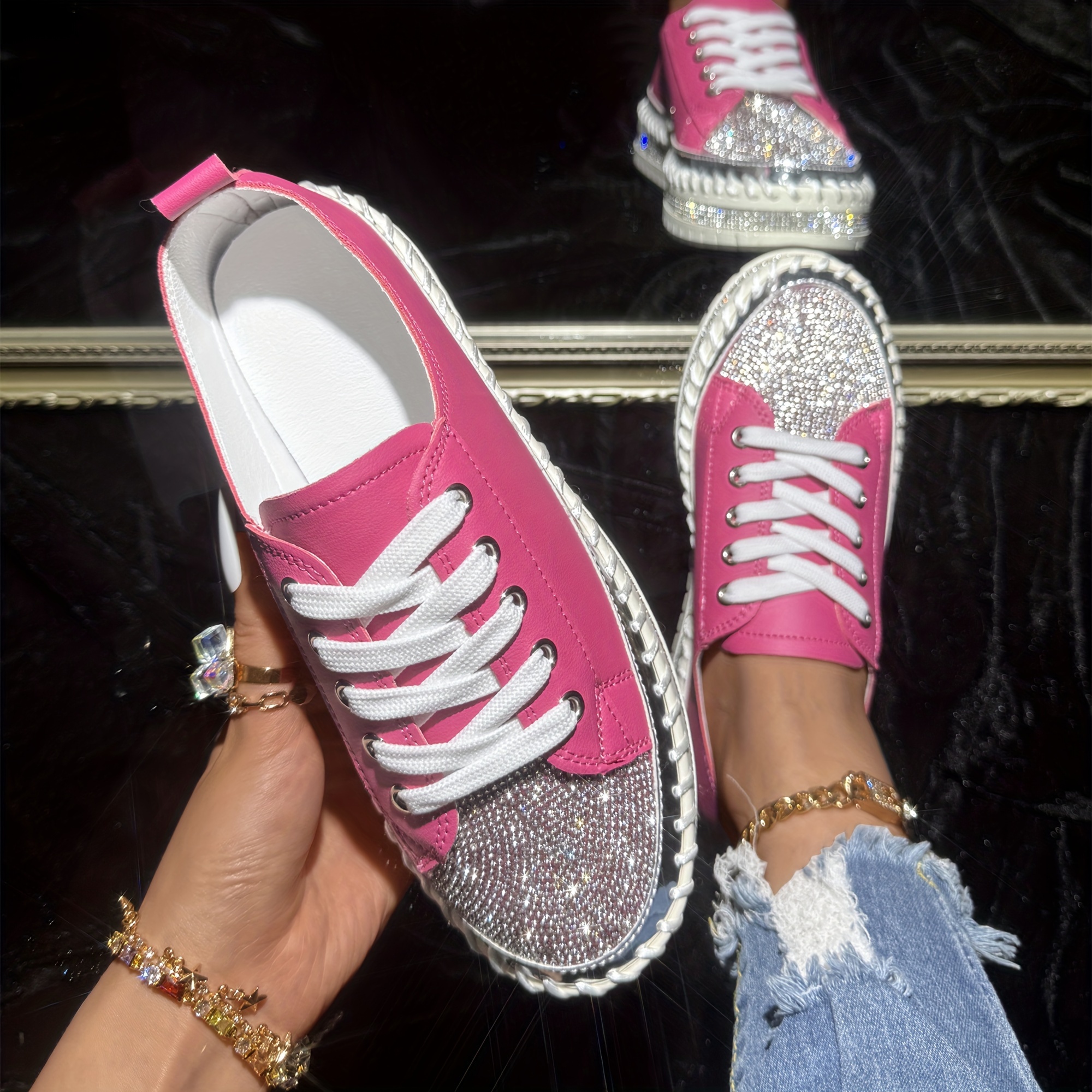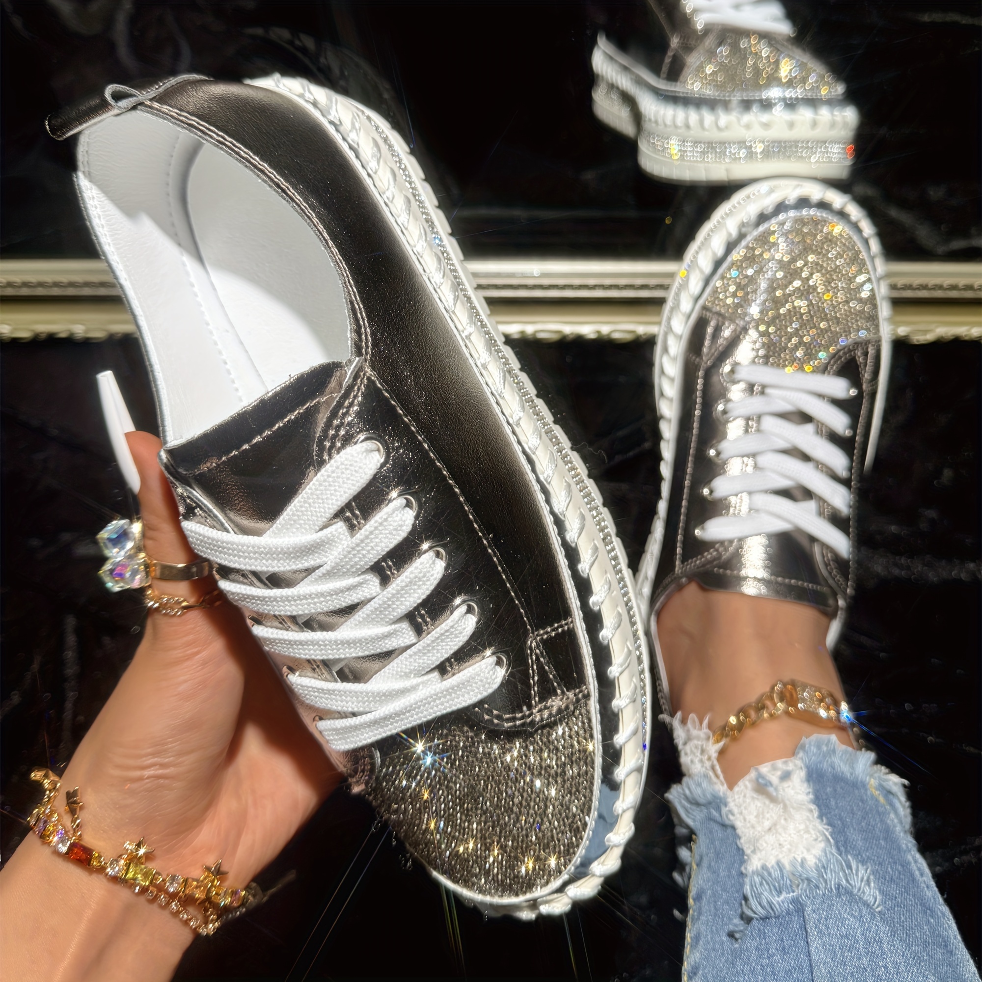 Women's Rhinestone Flat Sneakers, Fashion Round Toe Lace Up Low Top Skate Shoes, All-Match Outdoor Trainers