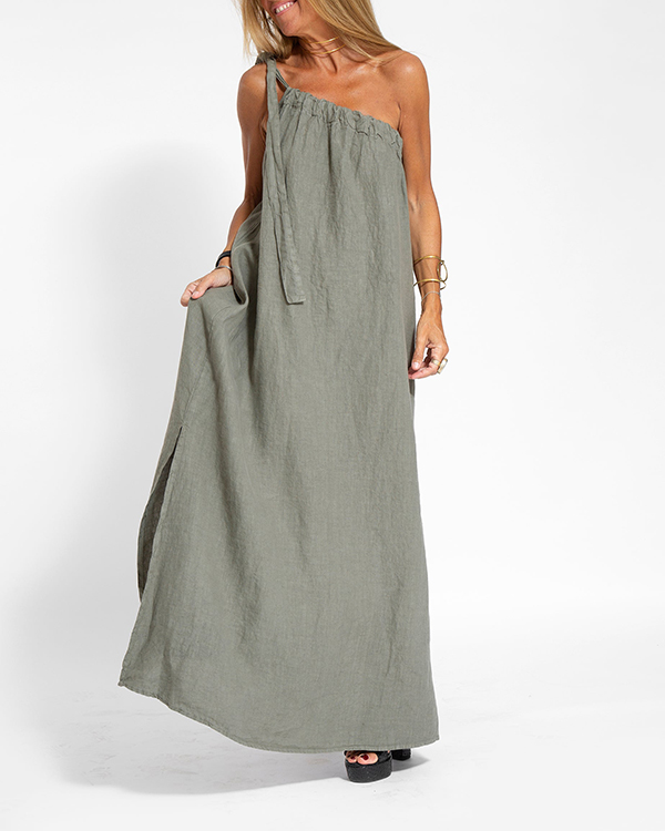 2023 Elegant Solid Sloping Shoulders Cotton Linen Sleeveless Long Dress