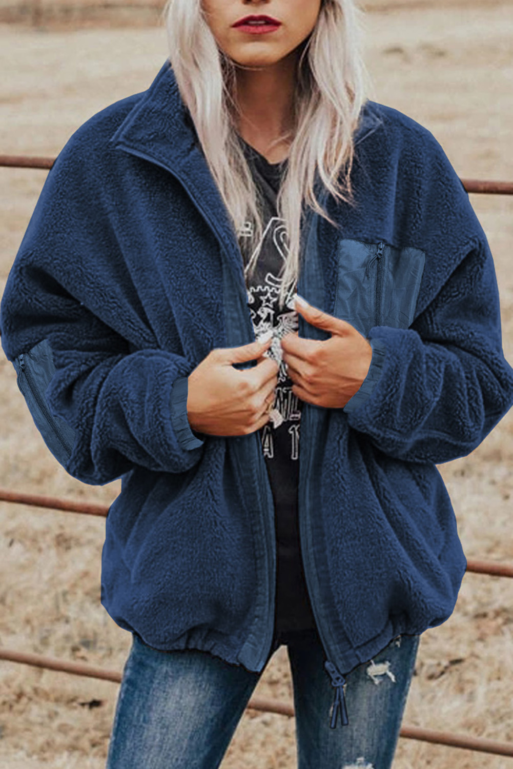 Blue Black Zip Up Sherpa Coat with Pocket