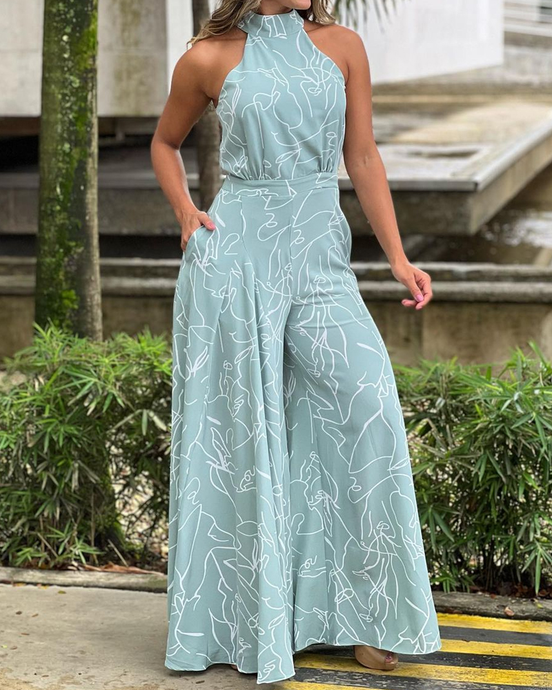 Halterneck Sleeveless Art Print Jumpsuit