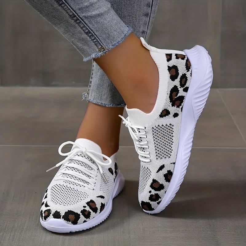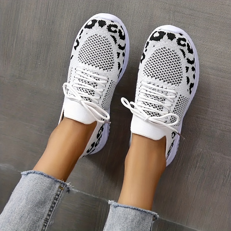 Leopard Pattern Breathable Running Shoes, Lace Up Knitted Sports Sneakers, Women's Footwear