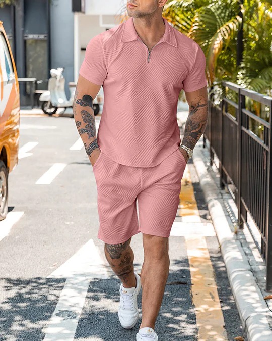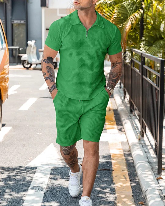 Men's Casual Polo Zipper Shorts Sleeve Suit