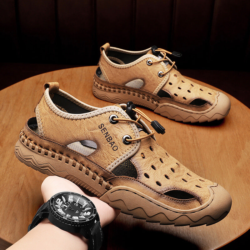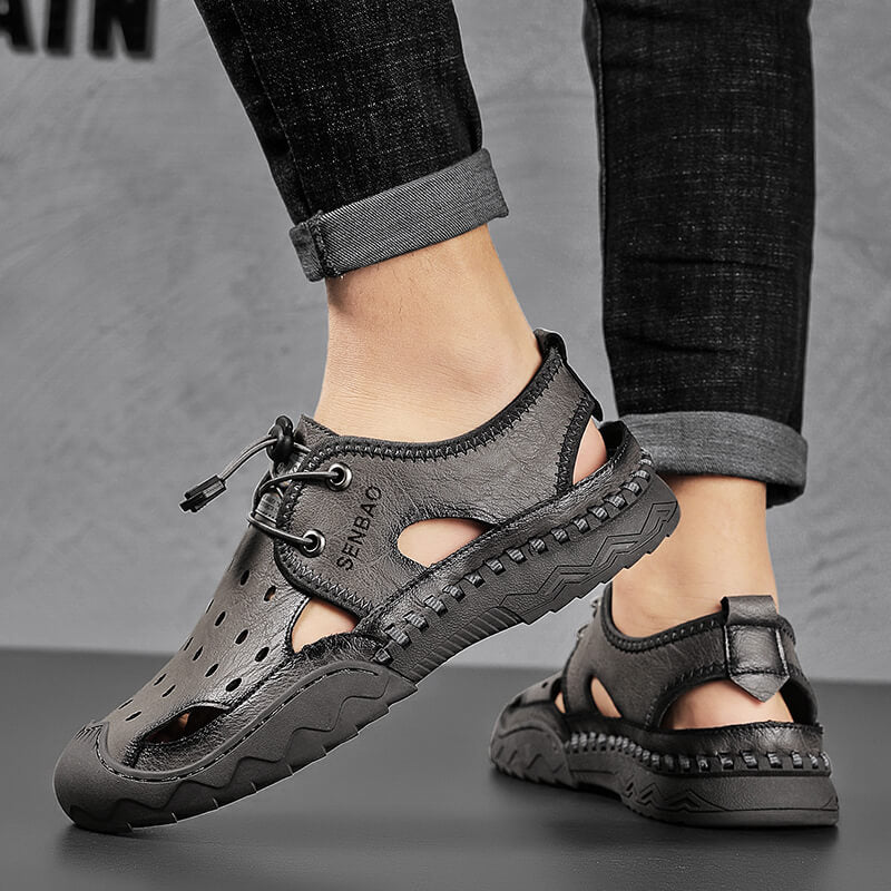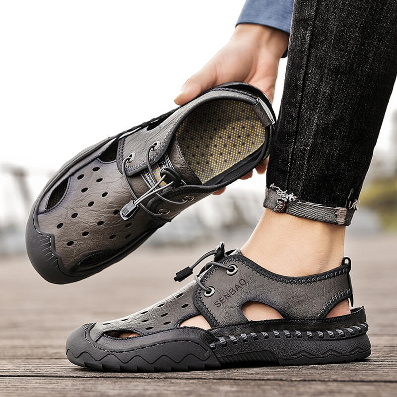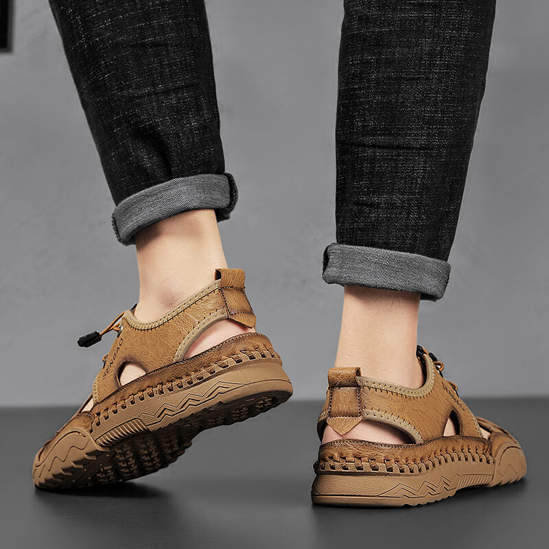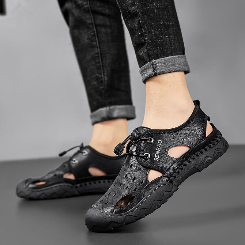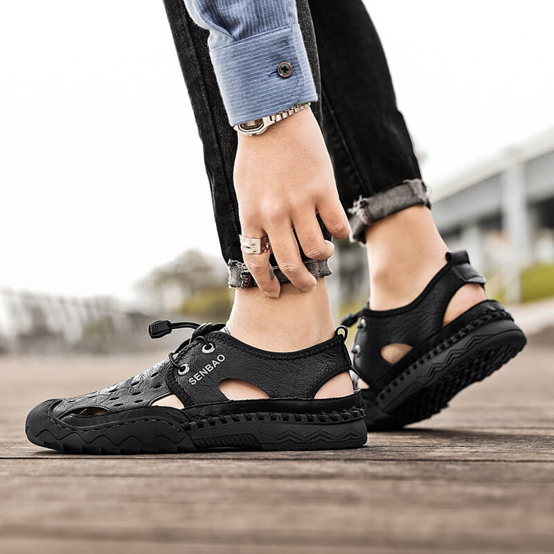 ??FRIENDLY:The mens sandals can be twistedmake you comfortable and relaxing.The closed toe design to a large extent protect you toe from hurtand the button make the leather sandals easy to put on and take off.
