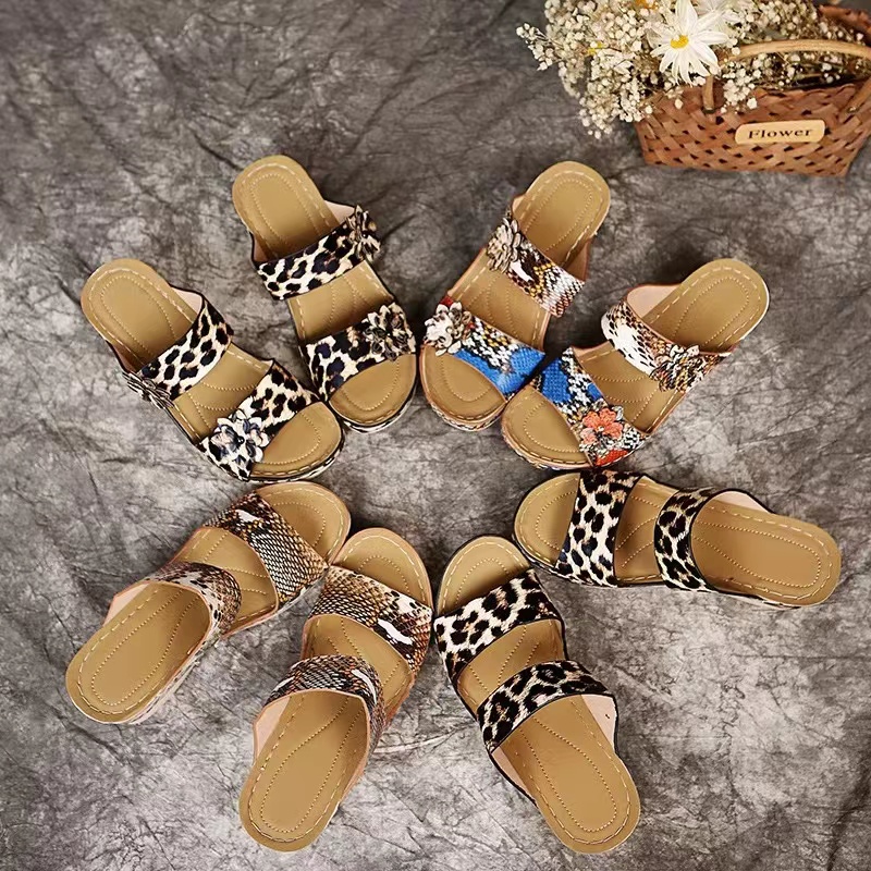 2022 New Leopard Print Genuine Leather Wedge Soft Sole Sandals