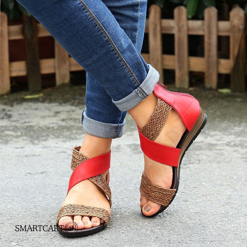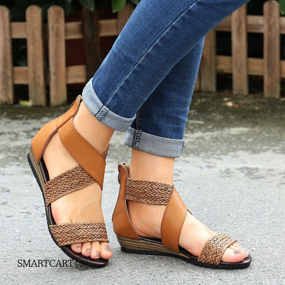 OCW Retro Sandals Women Comfortable Rome Splicing Peep Toe Zipper Flat Design