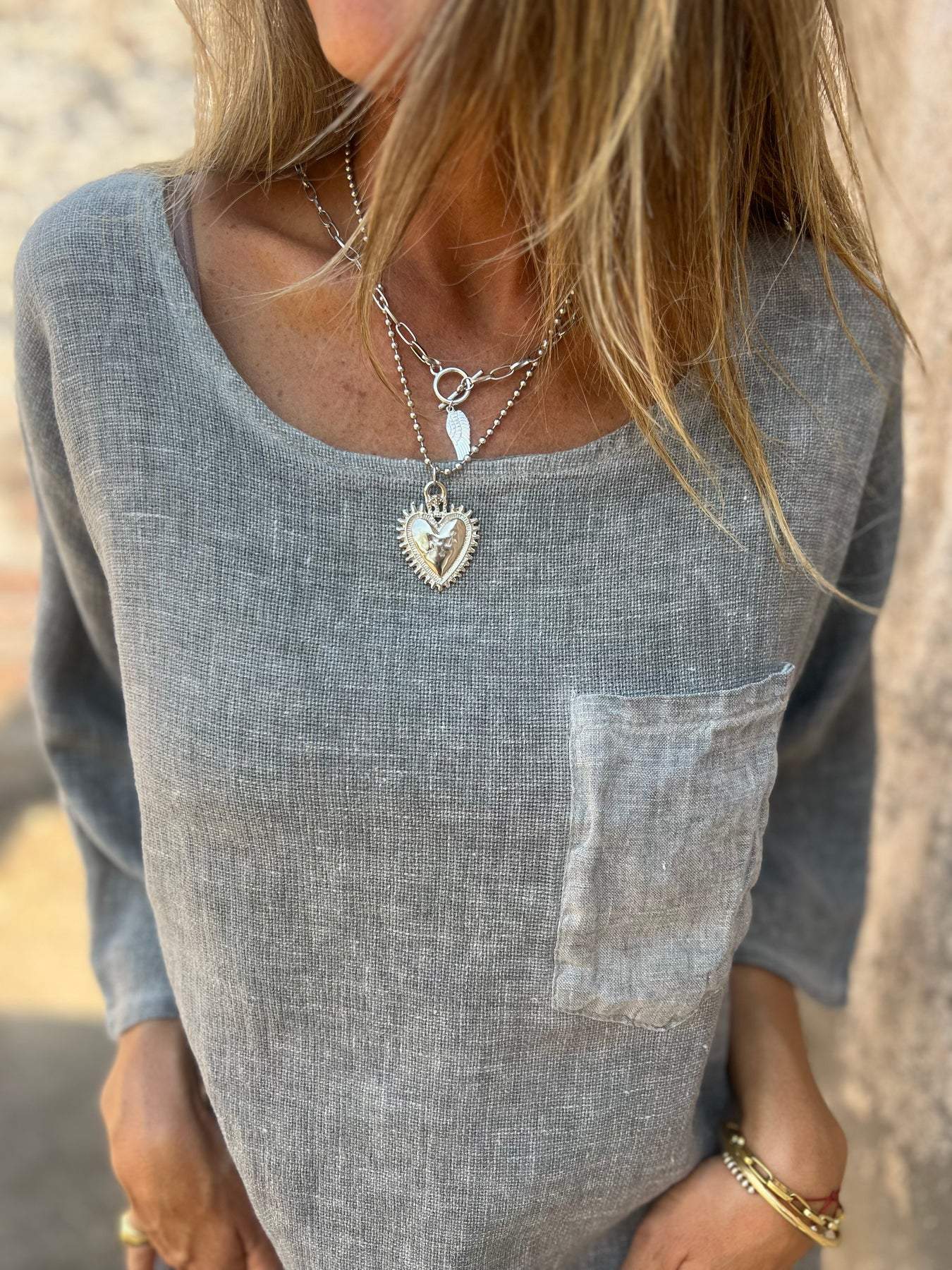 Round Neck Pocket Casual Cotton and Linen T-shirt