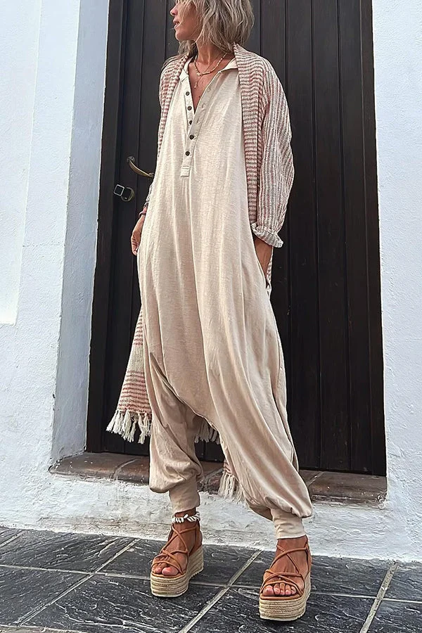 Elegant and cozy baggy linen jumpsuit for women, made of 100% natural gorgeous Linen fabric. We were working on creating the perfect cut jumpsuit romper for years, and finally here is one! It is very airy, but not too wide. There is very durable, high quality button design, so it is really easy to get out of this super comfortable piece. Linen fabric is antibacterial and breathable by its nature, so you can easily wear our jumpsuit overall without any underwear. A perfect match for layering or for lounging around the house.