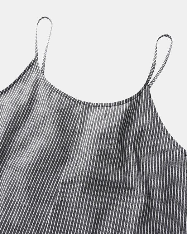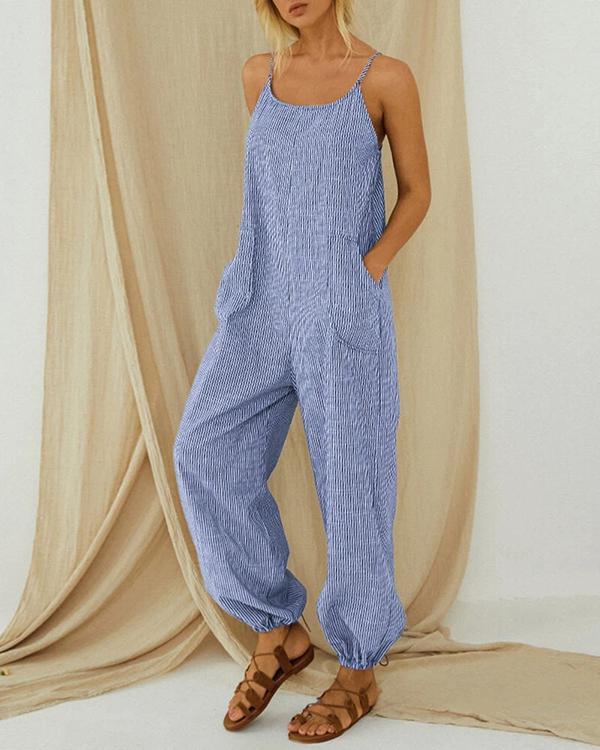 Striped Adjustable Shoulder Strap Loose Jumpsuit With Pocket
