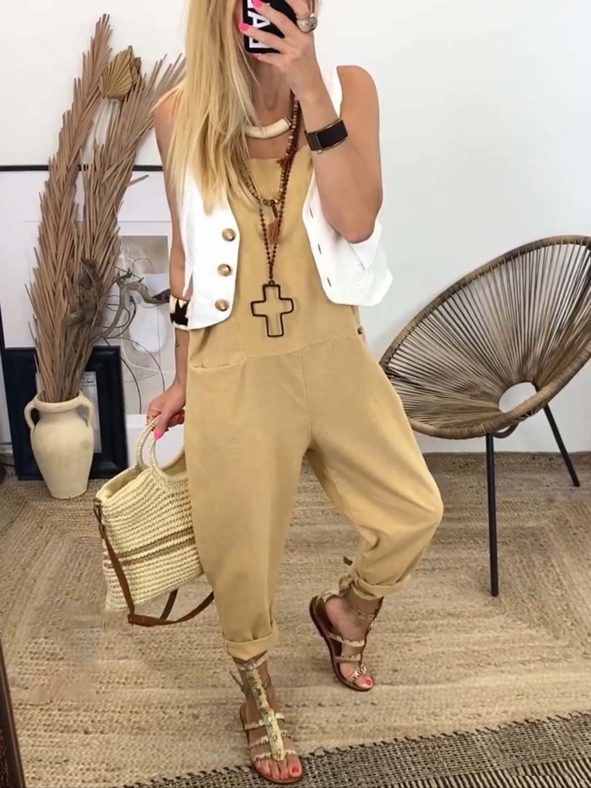 Women's Casual Pocket Front Overall Linen Jumpsuit