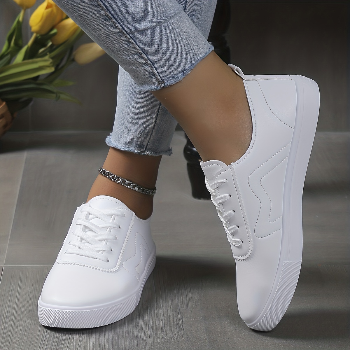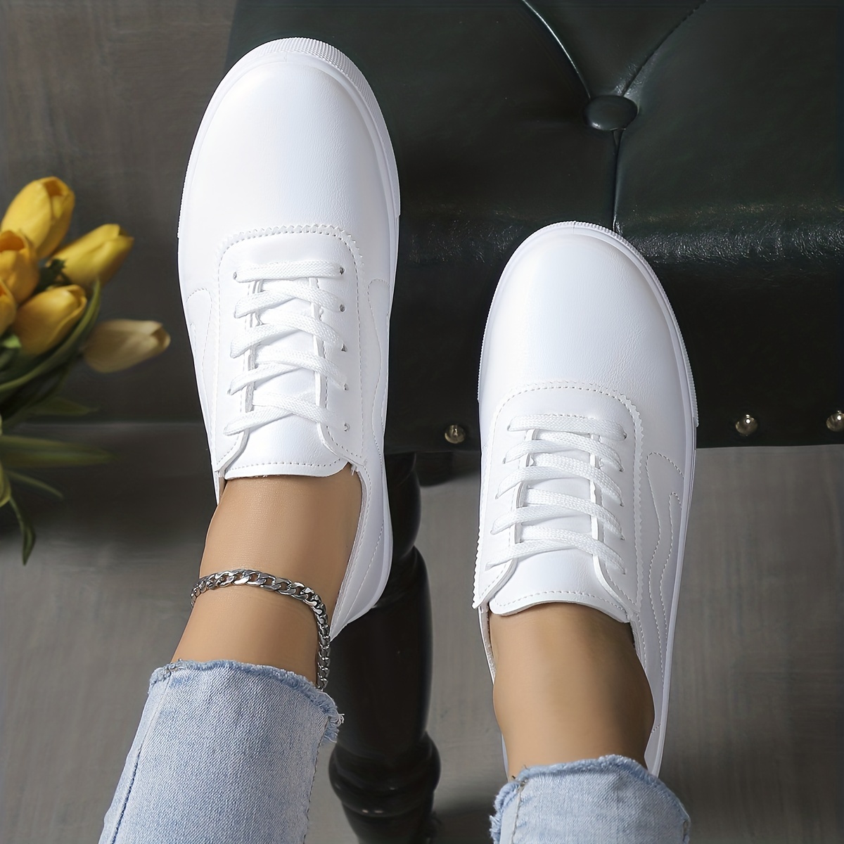 Women's Casual White Sneakers, Versatile PU Leather Lace Up Low Top Flat Shoes, Casual Walking Shoes