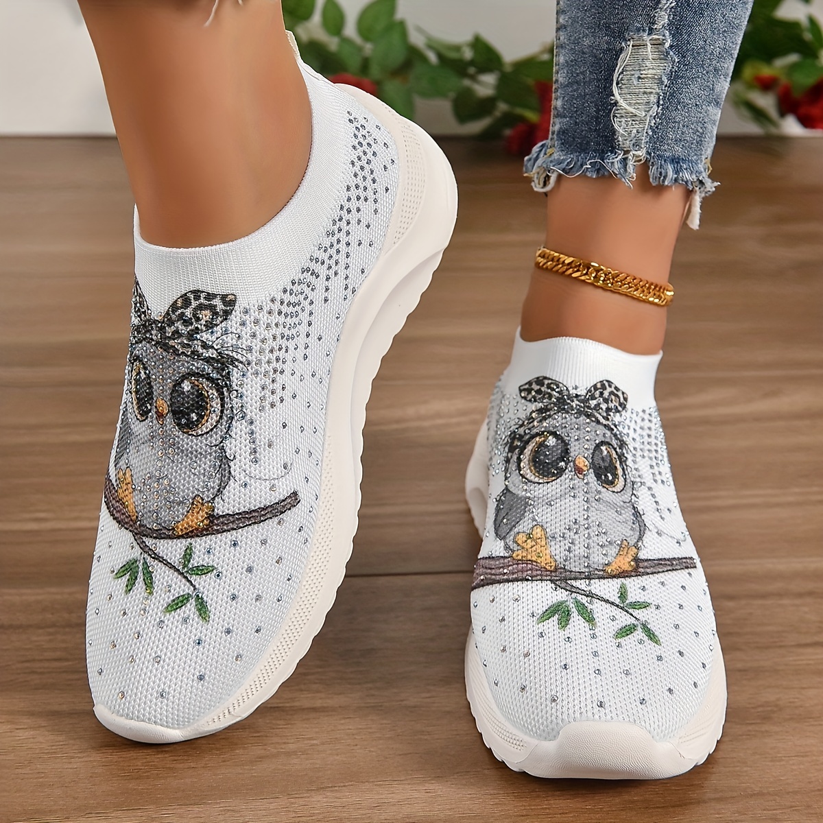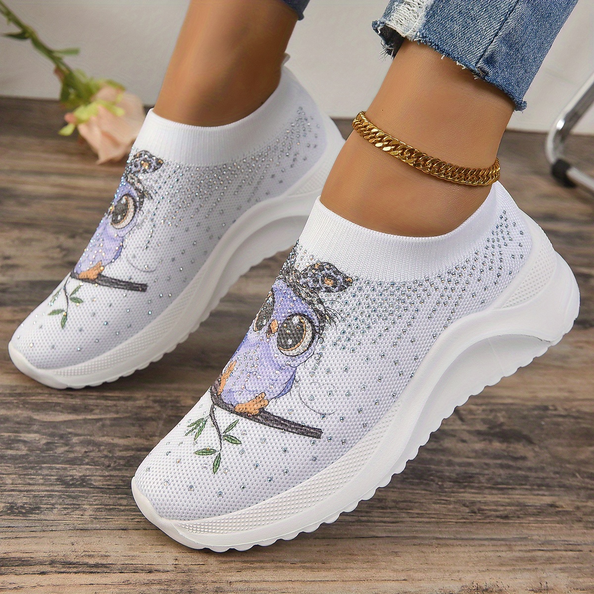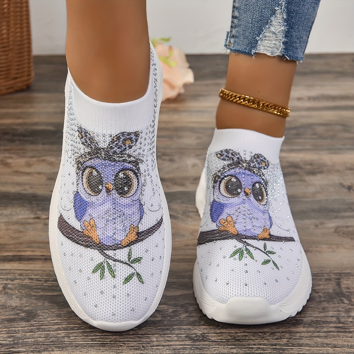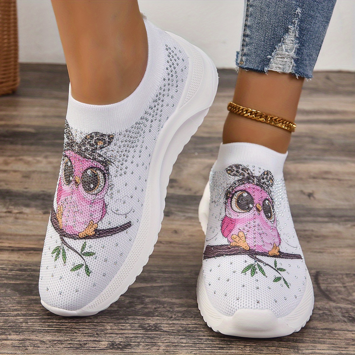 Women's Cute Owl Graphic Sneakers, Rhinestone Decor Knitted Slip On Sock Shoes, Casual Walking Shoes
