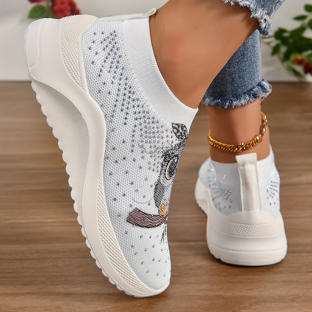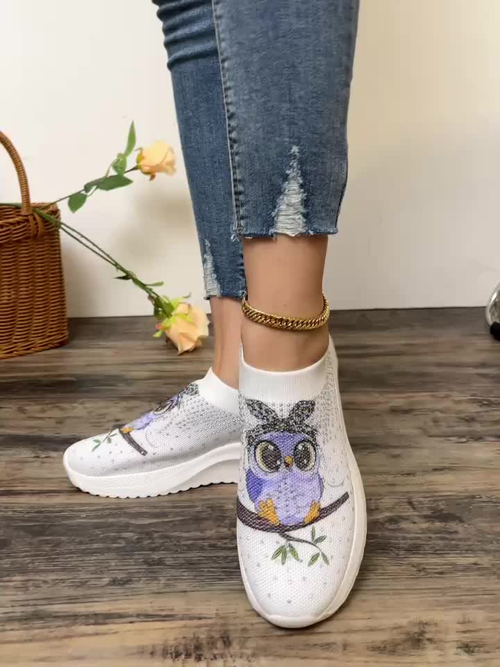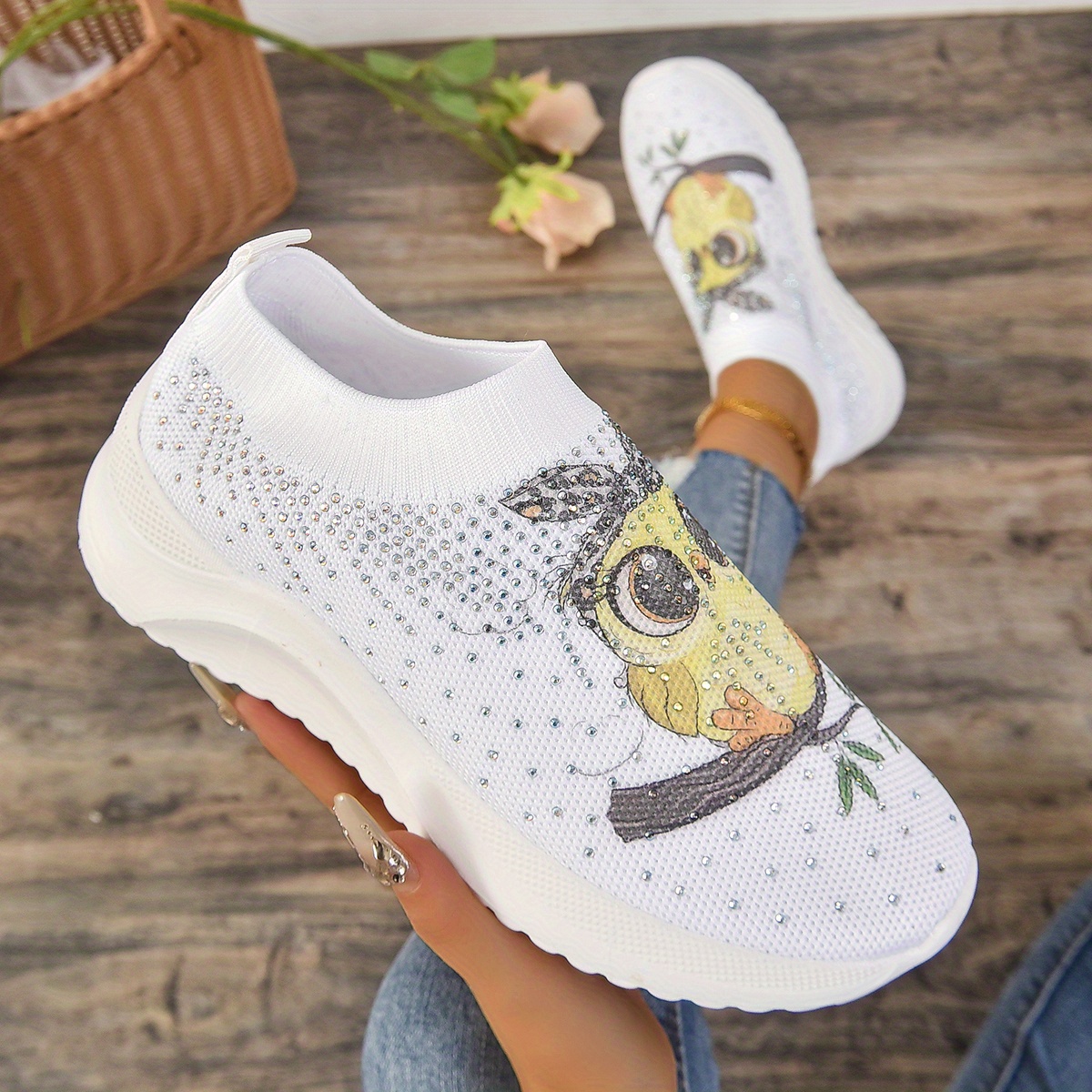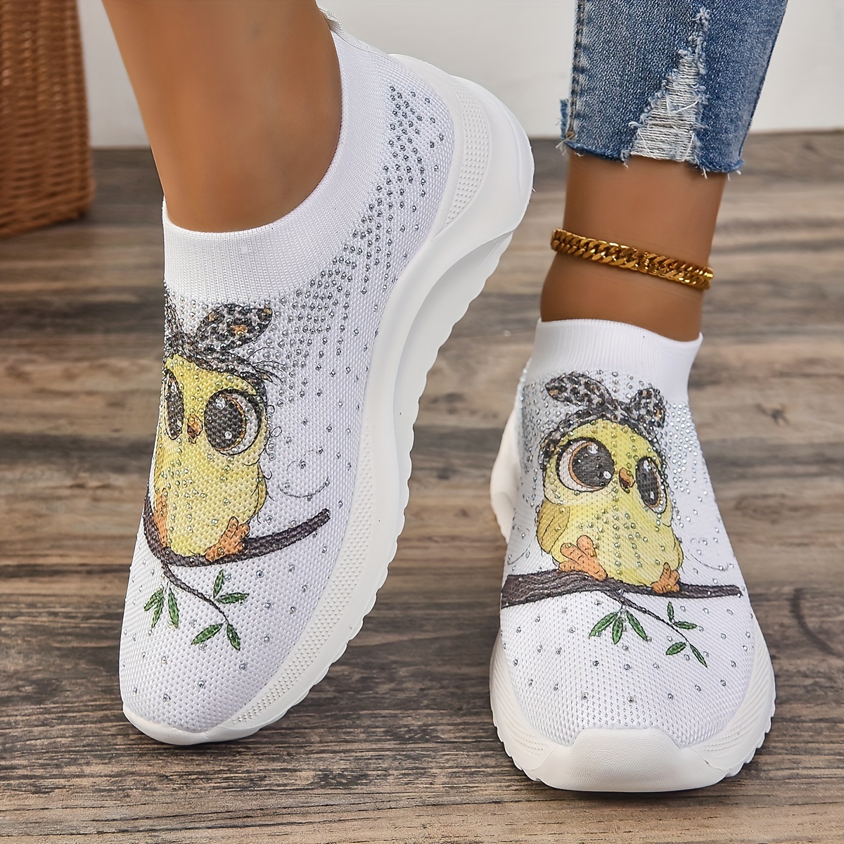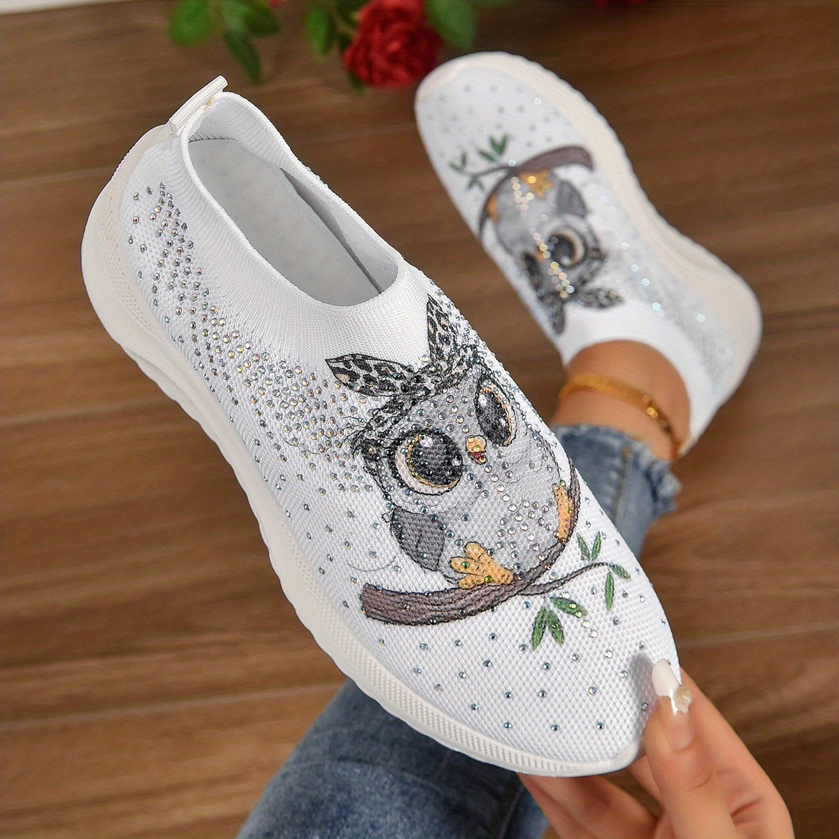 Women's Cute Owl Graphic Sneakers, Rhinestone Decor Knitted Slip On Sock Shoes, Casual Walking Shoes