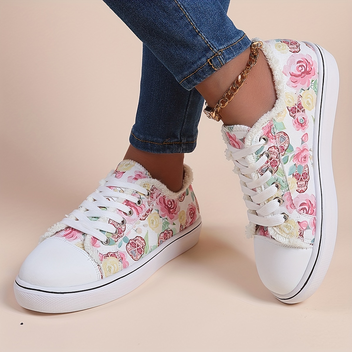 Women's Flat Canvas Shoes, Halloween Rose & Skull Print Low Top Shoes, Casual Walking Sneakers