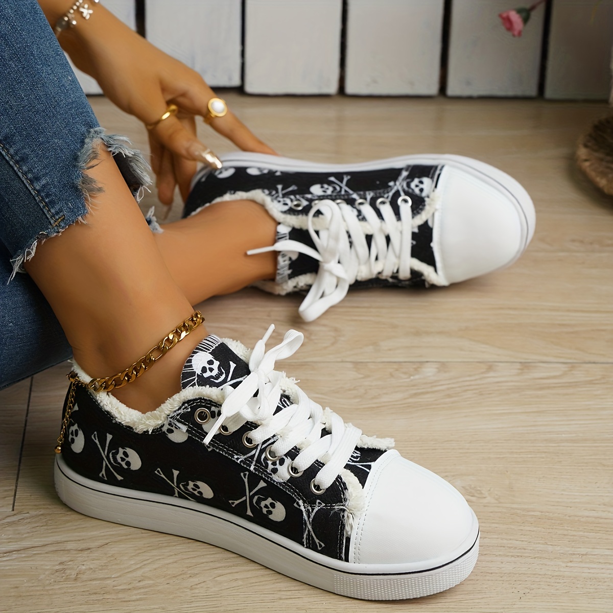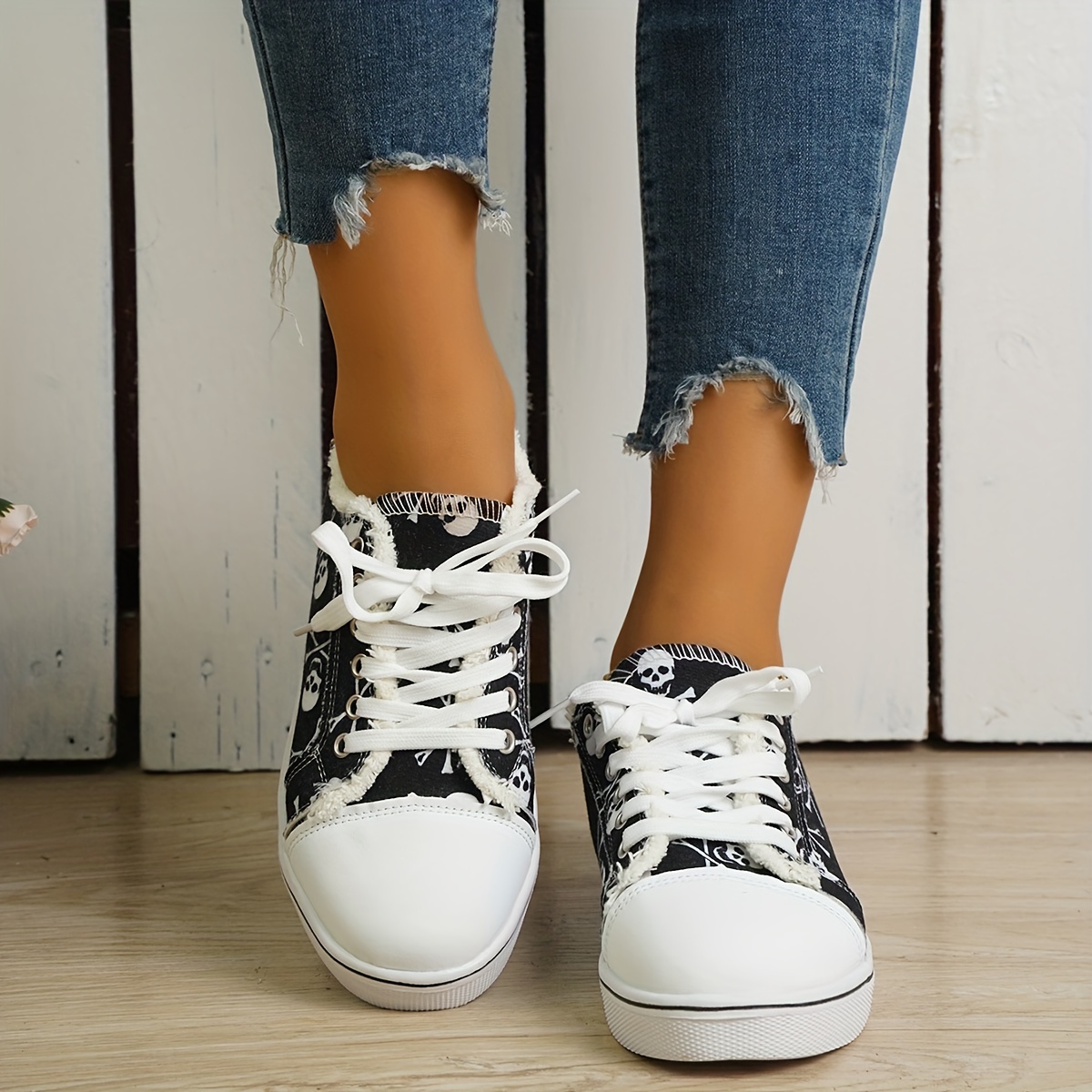 Women's Flat Canvas Shoes, Halloween Skull Print Low Top Sneakers, Casual Lace Up Walking Shoes