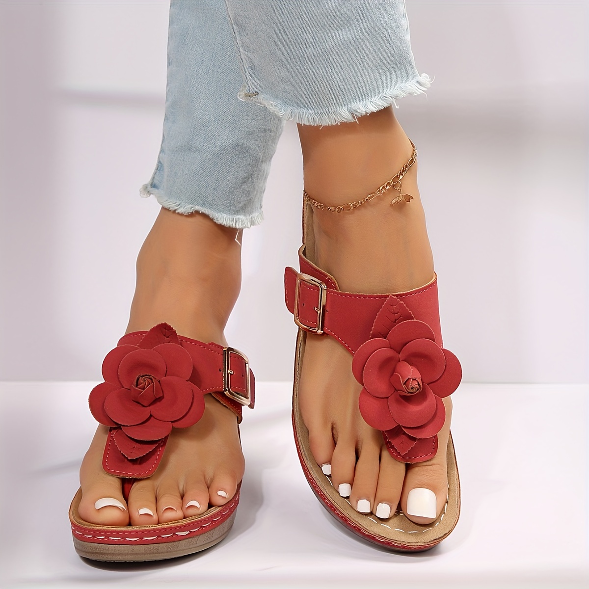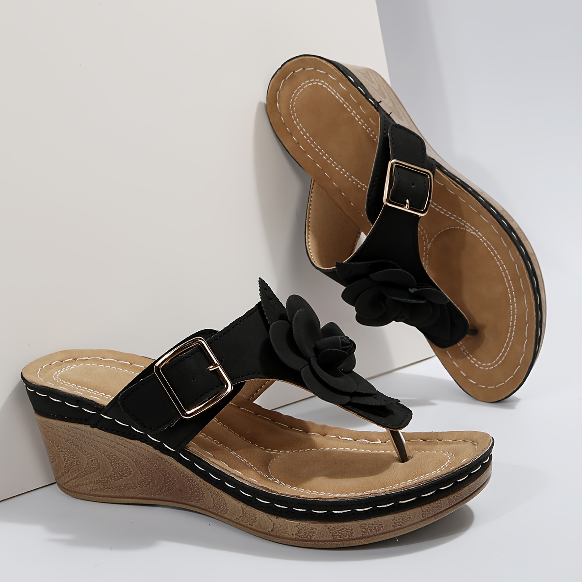 Women's Flower Decor Sandals, Solid Color Slip On Light Wedge Thong Sandals, Summer Comfy Women's Shoes