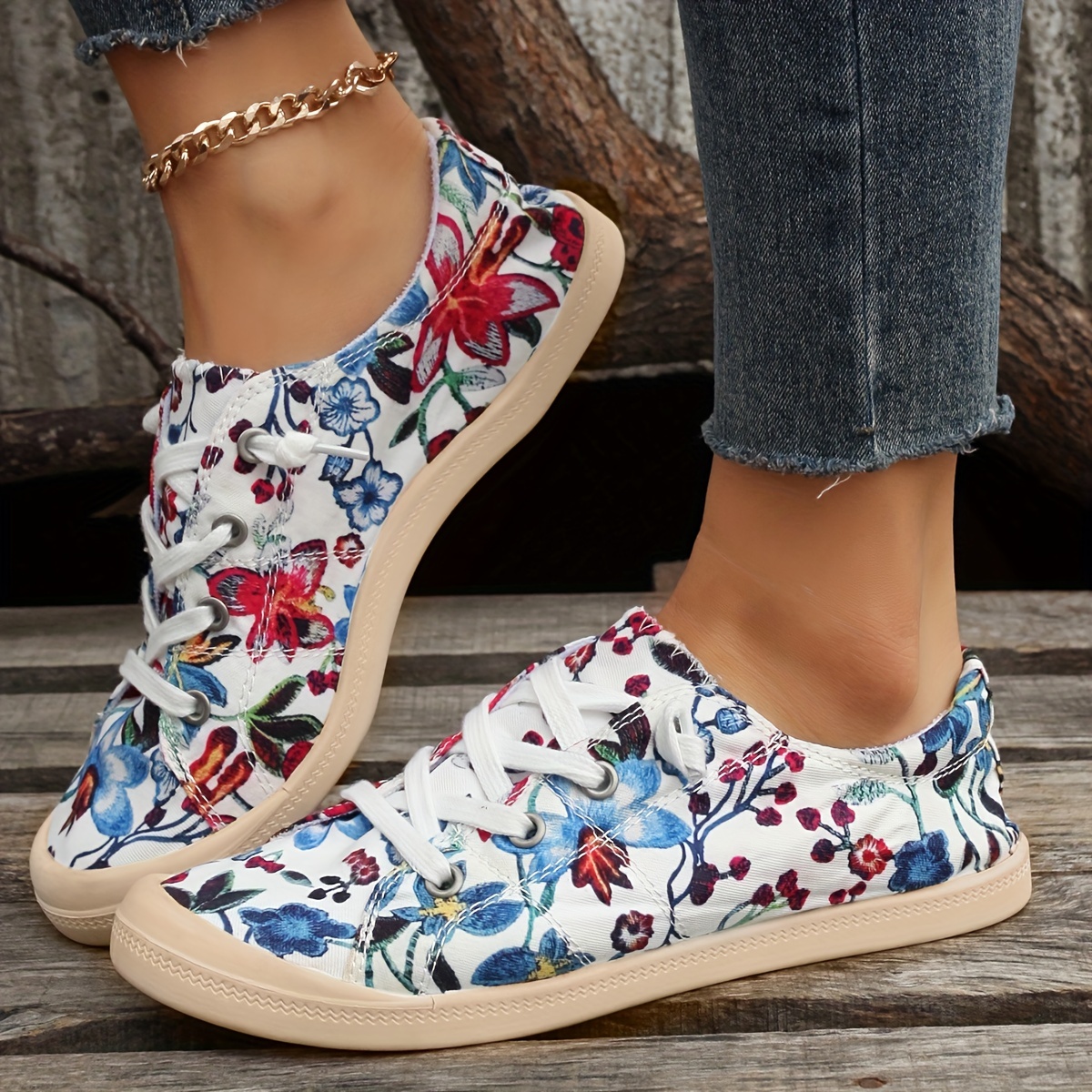 Women's Flower Pattern Canvas Shoes, Casual Lace Up Flat Sneakers, Women's Trendy Outdoor Shoes