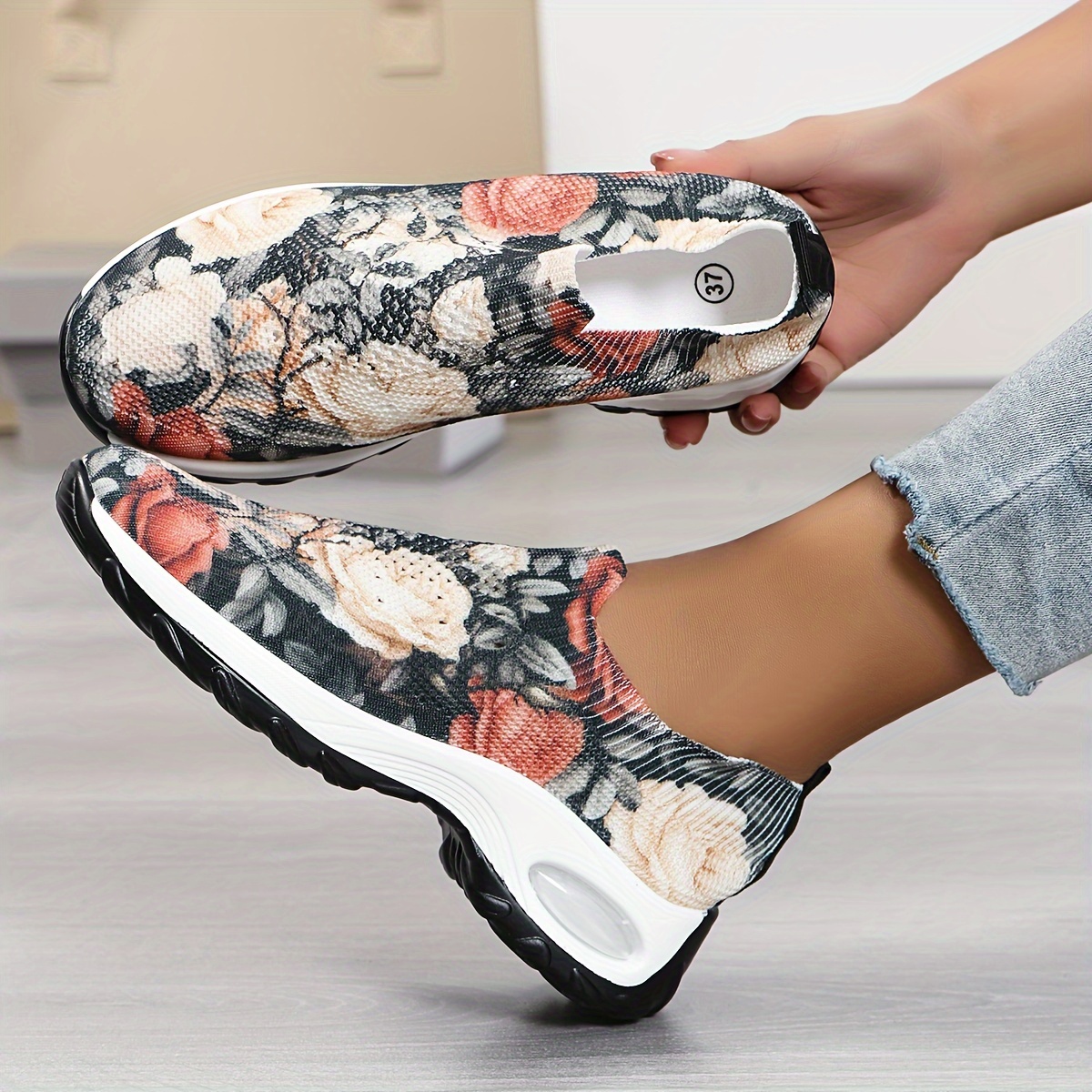 Women's Flower Pattern Chunky Sneakers, Breathable Knit Slip On Outdoor Shoes, Comfortable Low Top Sport Shoes