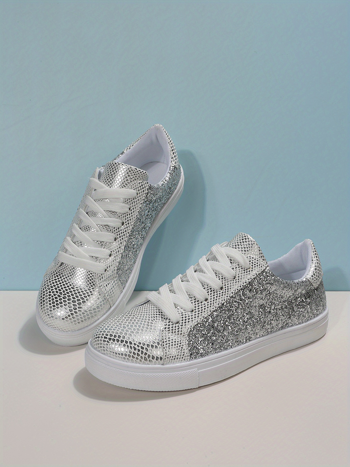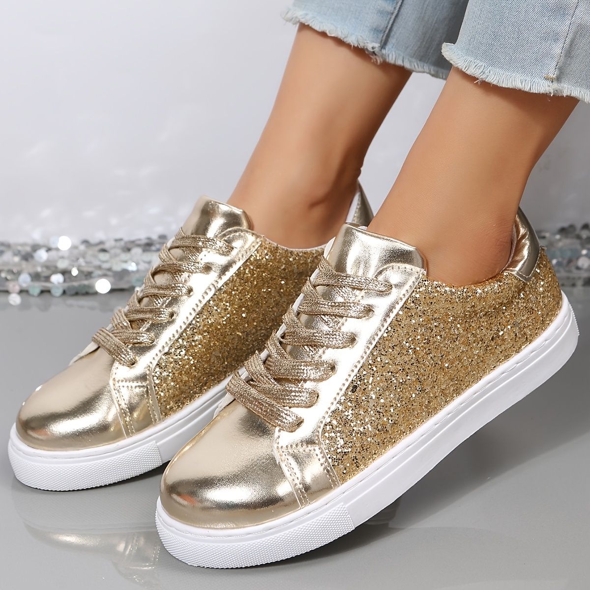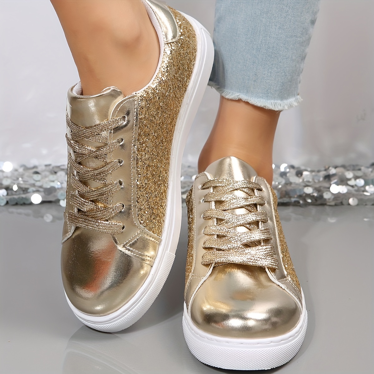 Women's Glitter Flat Sneakers, Fashion & Versatile Lace Up Low Top Shoes, Casual Walking Skate Shoes