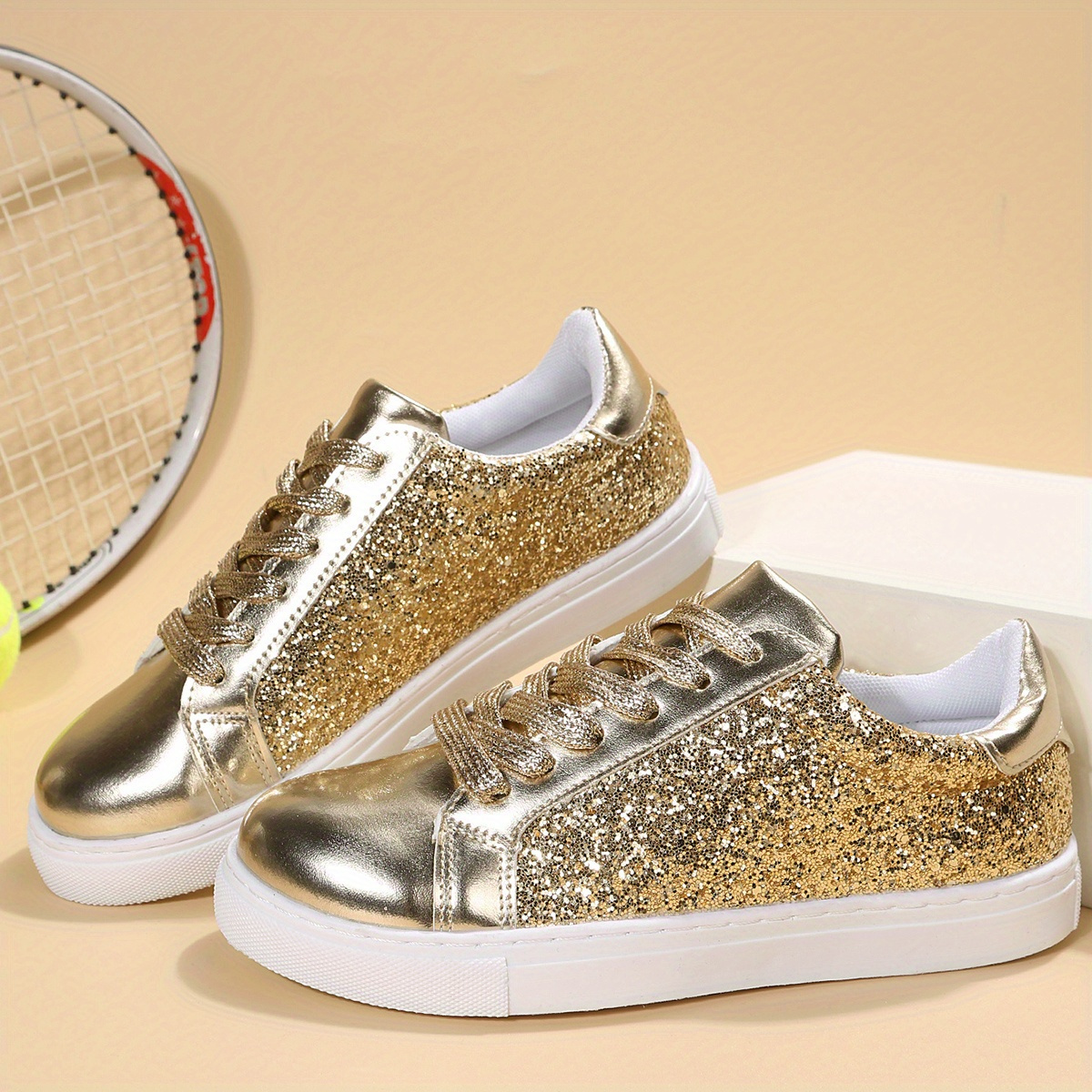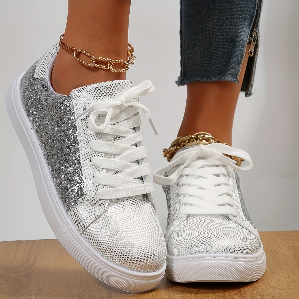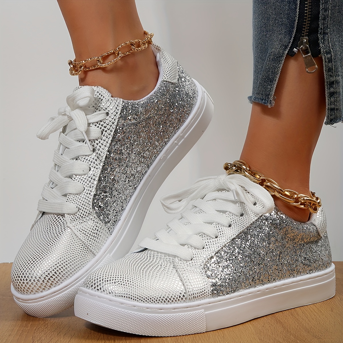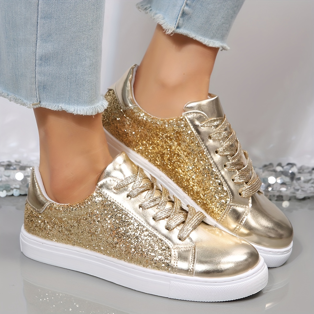 Women's Glitter Flat Sneakers, Fashion & Versatile Lace Up Low Top Shoes, Casual Walking Skate Shoes