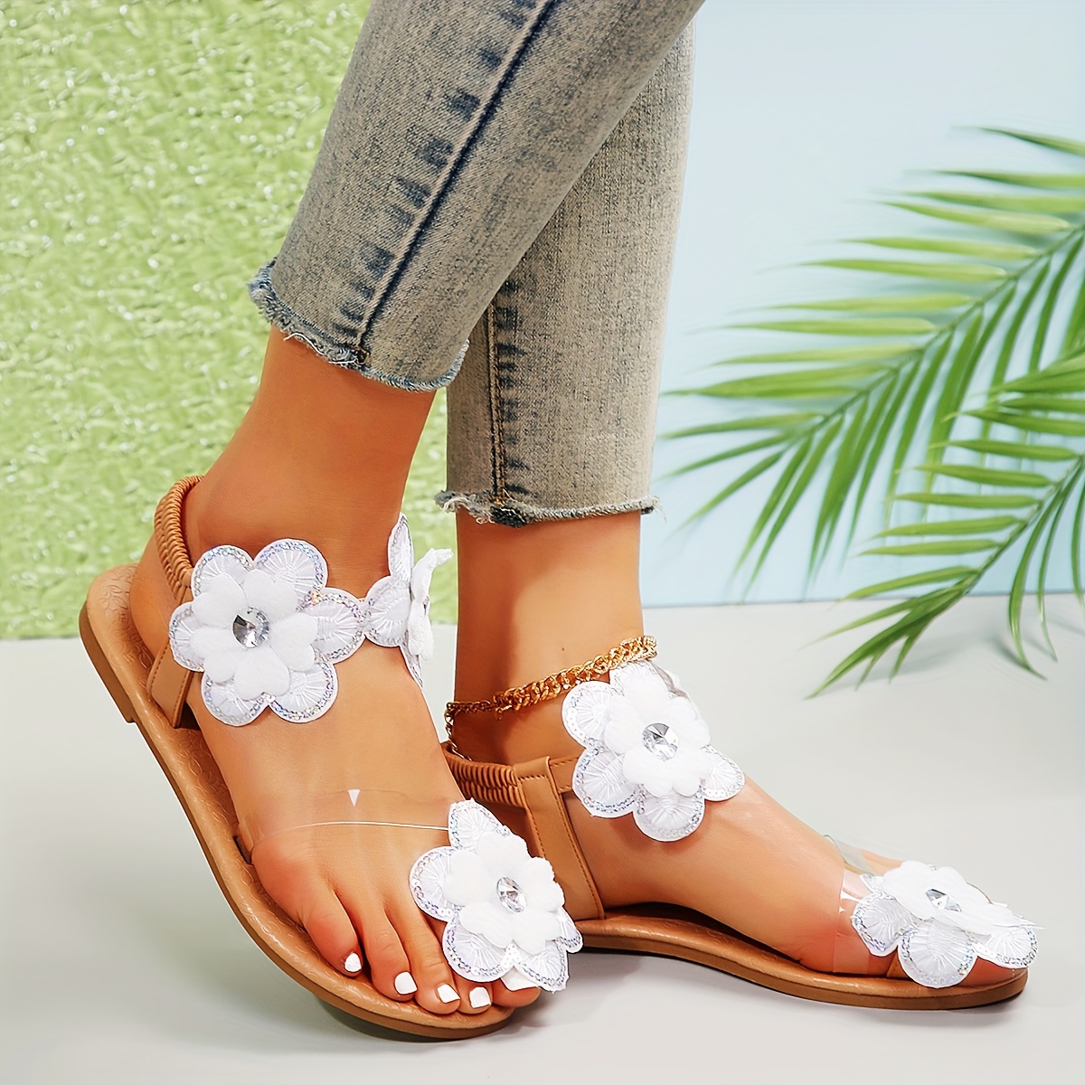 Women's Rhinestone & Flower Decor Flat Sandals, Casual Loop Toe Summer Shoes, Lightweight Slip On Sandals