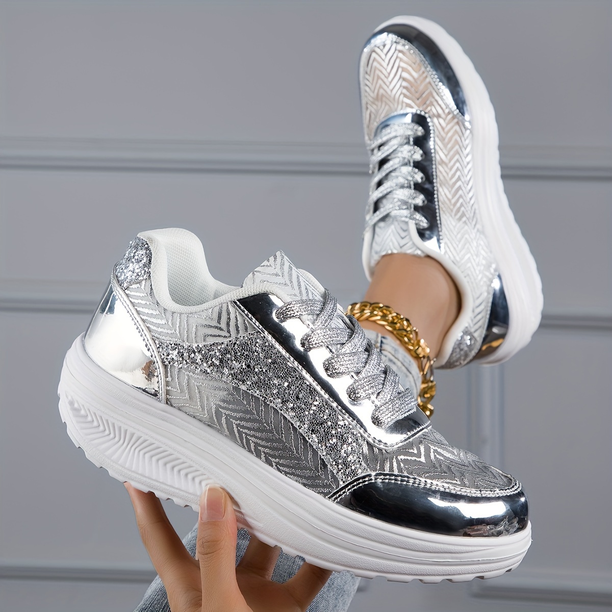 Women's Sequins Platform Sports Shoes, Fashion Mesh Low Top Sneakers, All-Match Outdoor Rocker Shoes
