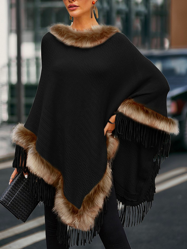 Women's Casual Oversized Fur Collar Fringe-Hem Blanket Poncho Cape Cloak