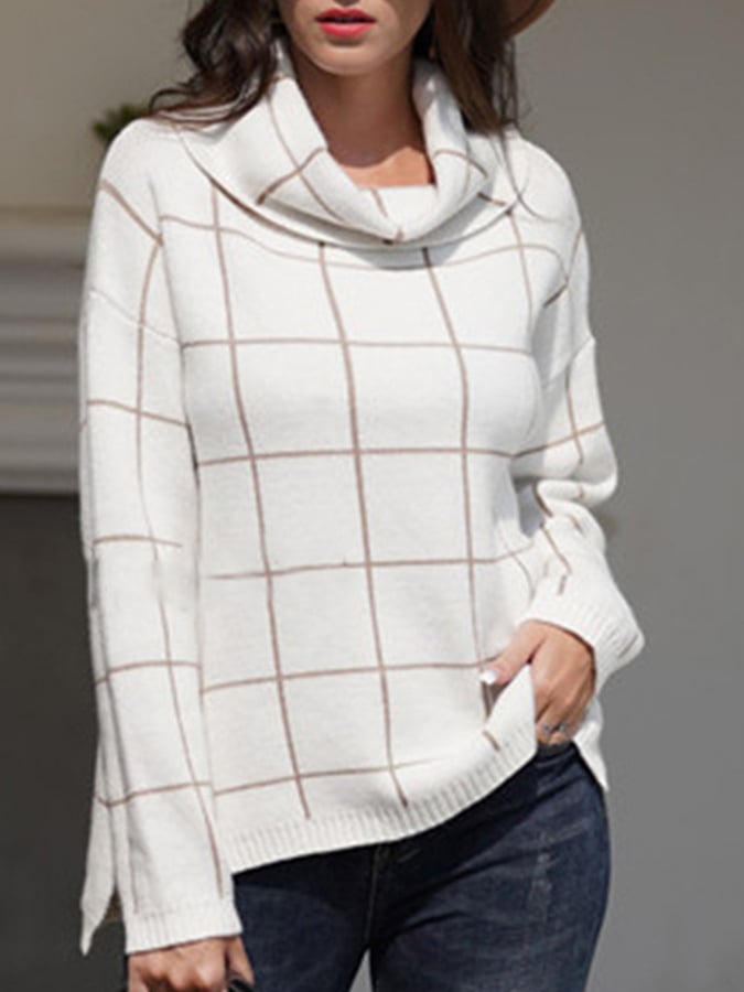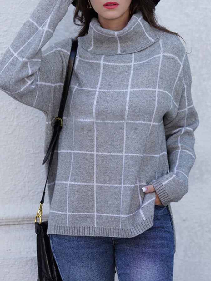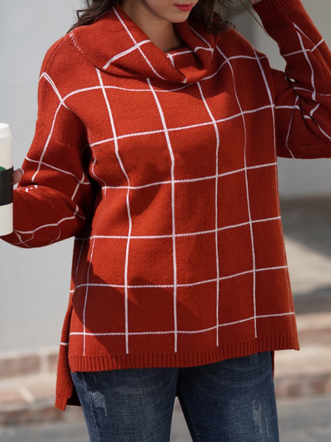 Women's Casual High Neck Loose Plaid Sweater
